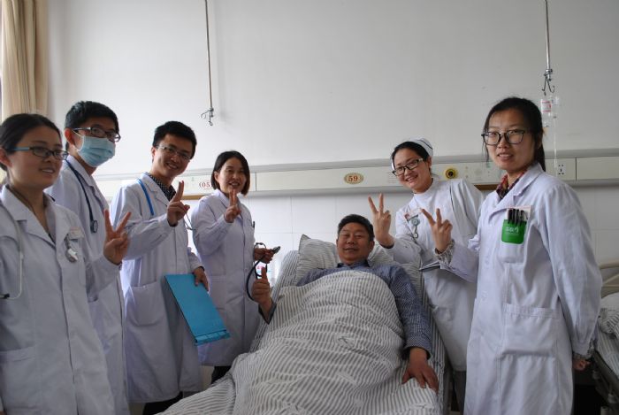 在第38天的時(shí)候,我做了一個(gè)夢(mèng)。夢(mèng)見我站在一個(gè)巨大的漩渦邊,我隨著漩渦越陷越深,就當(dāng)我感到無助的時(shí)候,突然有一只手緊緊的抓住了我。我夢(mèng)醒了,也是第一次蘇醒過來,第一個(gè)讓我看到的就是譚家明主任,他正按著我的脈搏。我永遠(yuǎn)也忘不了他說的那句話:“你終于醒過來了”。此時(shí),我才相信我的生命還在人間。妻子、我的弟弟及我的家人與醫(yī)護(hù)人員擁抱著,我的淚水在眼眶里打轉(zhuǎn)。當(dāng)時(shí)我不能說話,護(hù)理人員為我送上對(duì)話板,我寫下了“今生”的第一個(gè)字“謝”!以后的17天里,在醫(yī)生、家人的精心照顧和積極鼓勵(lì)下,我的各項(xiàng)生命指標(biāo)基本正常,直至轉(zhuǎn)入普通病房。此時(shí),窗外的綠樹已經(jīng)吐出新芽,整個(gè)醫(yī)院煥發(fā)著勃勃生機(jī)。
