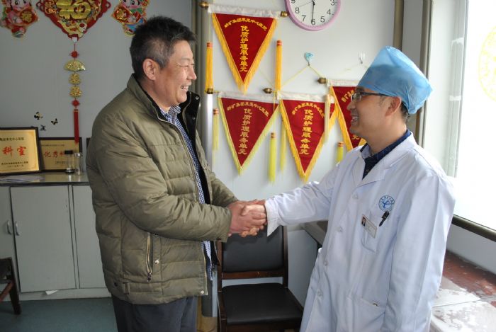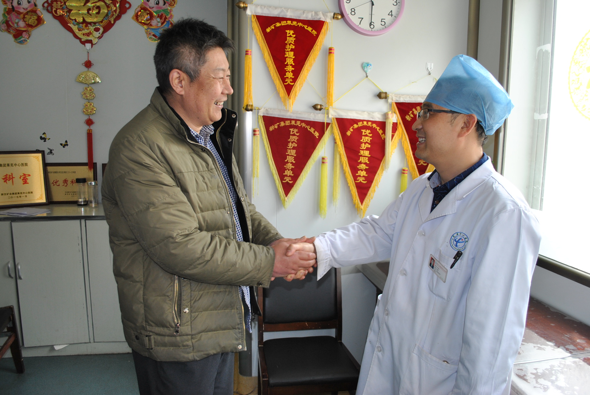 6年來,我把新礦萊蕪中心醫(yī)院當(dāng)成我的第二個(gè)家,每隔兩三個(gè)月就來院檢查一次。醫(yī)護(hù)人員熱情的和我打招呼,了解我的病情,讓我從心里感到溫暖。最后,我想用一句話表達(dá)我對(duì)新礦萊蕪中心醫(yī)院的感激:是你們用生命成就了我的生命,謝謝?。ɑ颊哓料壬谑?,劉高德整理)圖1: 2011年農(nóng)歷臘月27日下午為亓先生置入球囊。圖2:亓先生在ICU搶救治療時(shí)的情景。圖3亓先生轉(zhuǎn)入普通病房后與醫(yī)護(hù)人員一起表示祝賀。圖4康復(fù)后的亓先生向該院ICU主任譚家明表示感謝。